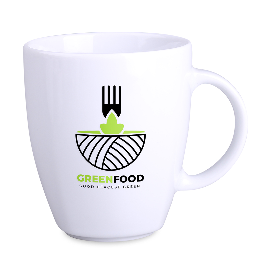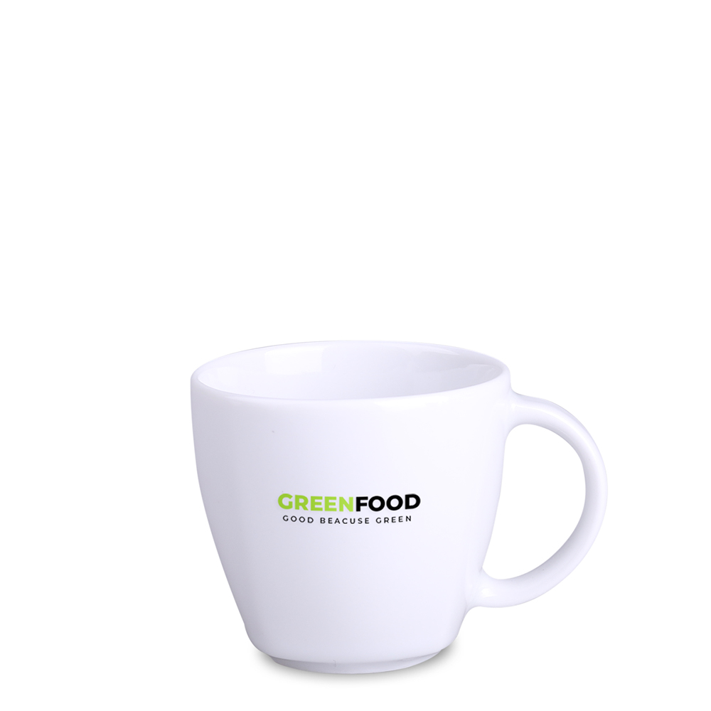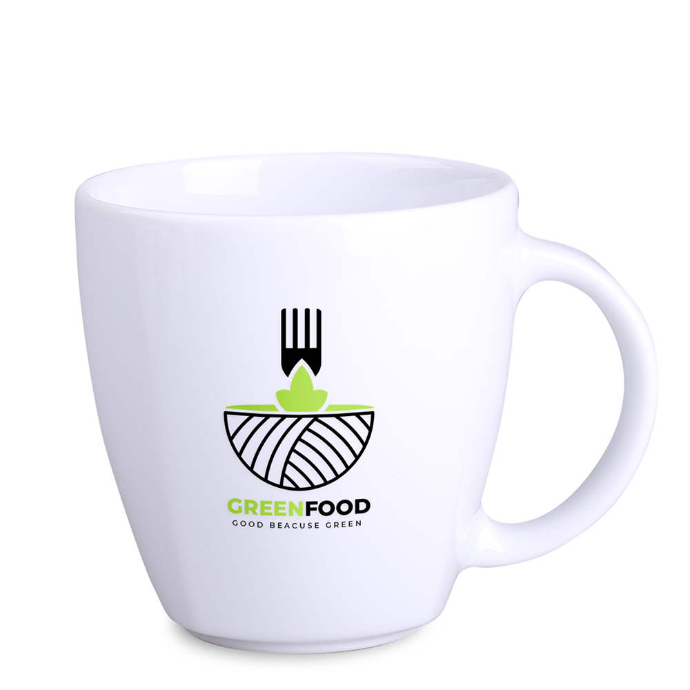 Porcelanowy kubek reklamowy dostępny w dwóch wersjach rozmiarowych. Cechą charakterystyczną tego fasonu są delikatne krawędzie widoczne w jego dolnej części.